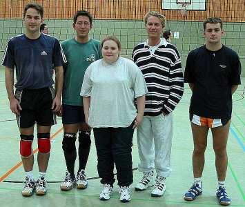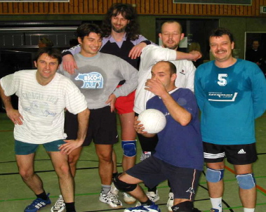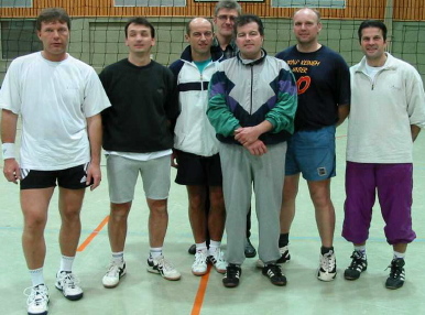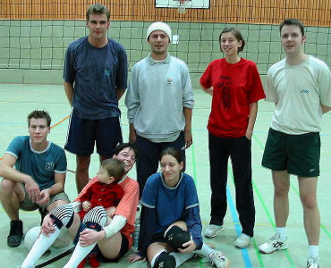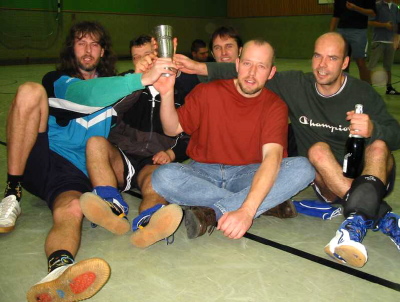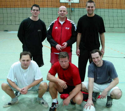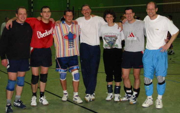 | Harte Auswahl | Leider brachte der gewählte Turniermodus für einige Mannschaften große Härten mit sich: Es wurde in drei Vierergruppen gespielt, von denen die Gruppenersten um die Plätze 1bis 3, die Gruppenzweiten um die Plätze 4 bis 6 und so weiter spielten. In der Todesgruppe II trafen die »Ruhrpott-Kanacken« (Turniersieger) auf puli@web.de (links; ausnahmslos Spitzensportler ihrer jeweiligen Disziplin und Super-Allrounder) und auf die »Nethoppers« (unten, mit Markus Fischer links außen im Bild), die in den letzten beiden Jahren den Pokal gewonnen hatten.
