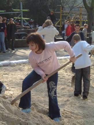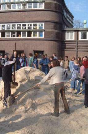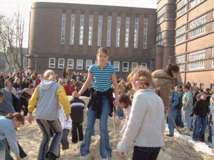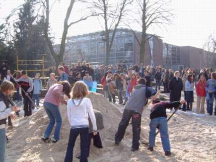| Aus Baustelle wird karibischer Volleyball-Strand | Am Montag, dem 17. März, stürzten sich ein paar Dutzend »Stein«-Schüler auf die beiden wohlgeformten Haufen und machten daraus einen wohlgeformten Strand. |