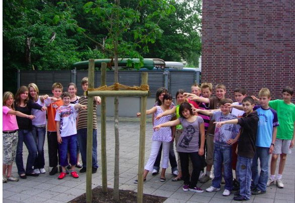 Im Hof steht ein Kastanienbaum, Der ist klein, man glaubt es kaum, Er hat drei Stützen drum, so tritt ihn keiner um. |  | | Foto: Thomale | Tanja Lokancevik, Klasse 6d, berichtet: Voller Begeisterung spendeten die Schüler aus dem evangelischen Religionskurs der Klassen 6b/d von Frau Thomale jeweils zwei € für eine Baumaktion unserer Schule. Bei der Unterrichtsreihe »Tiere und Menschen in der Schöpfung« beschäftigten wir uns auch mit dem Thema der globalen Erwärmung und der Frage; was wir ganz persönlich dagegen tun könnten. Eine Mitschülerin kam dabei auf die Idee, ein Bäumchen zu pflanzen. Uns und auch Frau Thomale gefiel dieser Gedanke sehr gut und wir haben beschlossen, insgesamt 40 € für die Pflanzung eines Baumes zu sammeln. Es war aber natürlich klar, dass wir einen größeren Baum nicht ganz alleine bezahlen können. Somit fragten wir als erstes einmal die Biologen an unserer Schule, welchen Baum wir denn noch zu dieser Jahreszeit pflanzen könnten. Danach haben wie bei der SV nachgefragt, ob sie uns bei der Pflanzung helfen könnten. Die SV hat uns gerne unterstützt. Am 22. Mai 2007 war es dann so weit und inzwischen wächst und gedeiht der neue Kastanienbaum (Foto). Unsere Religionsklasse ist sehr froh, dass wir wenigstens ein bisschen unserer Umwelt helfen konnten. Vielleicht könntet ja auch ihr einen kleinen Kirschbaum, oder einen Apfelbaum pflanzen. Es würde der Umwelt sehr helfen. Noch einmal vielen lieben Dank an die SV! |