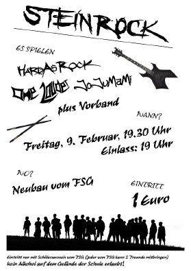 | Bands heizen ein | Am Freitag, dem 9. Februar, erbebte die FSG-Aula in ihren Grundmauern, als abends die Schulbands aufspielten. Malte Eiffler berichtet: »Steinrock« hat gerockt!!! Konzertbeginn war erst um 19.30 Uhr. Doch für die meisten Beteiligten begann der Stress schon nachmittags um drei Uhr. Sachen wurden in die Autos geladen und wieder ausgeladen. Es wurde aufgebaut, umgestellt, umgebaut und sonst noch alles. Als dann auch der Soundcheck endlich abgeschlossen war (das war so gegen 18 Uhr), konnte man sich doch noch mal eine kurze Pause gönnen und was essen, bevor es richtig los ging. Und das ging es dann auch. Das Foyer wurde ab 19 Uhr immer voller, womit keiner so richtig gerechnet hatte. Alle warteten sehnsüchtig, dass es endlich 19.30 Uhr wurde. Dann war es soweit: Rattenfänger begannen. Sofort war das Publikum voll da und es herrschte eine super Stimmung. Der Sound war sogar erstaunlicherweise gar nicht so schlecht, obwohl wir uns echt mit einigen Tricks behelfen mussten, damit dies auch so war. Die Stimmung war da und blieb bis zum Ende. Alle Bands haben hervorragend gespielt und für jeden war es ein tolles Erlebnis! Gegen 23.00 Uhr hieß es dann: Feierabend, zumindest für die Zuschauer, denn die Sachen mussten ja auch wieder eingepackt werden. Gegen Mitternacht hatten dann auch alle Aktiven Feierabend. Das Konzert war ein großartiger Erfolg und wir hoffen, dass jedermann seinen Spaß hatte! Wir danken noch mal allen Leuten, die diesen Abend ermöglicht haben!!! Wir danken in erster Linie Herrn Schattauer. Sein Engagement für uns hat uns sehr geholfen, diesen Abend zu organisieren. Auch danken wir Herrn Dr. Czischke, Herrn Gehrmann und Herrn Graas für ihr Entgegenkommen. Wir danken Reiner Fröhlich für seine Unterstützung, die Würstchen zu verkaufen, und wir danken allen Schülern des FSG, die uns tatkräftig unterstützt haben und absolut zuverlässig waren. |