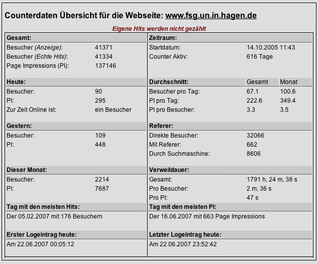 | Website-Statistik zeigt stetig nach oben | Seit dem 14. Oktober 2005 verfolgen wir mit einer Website-Statistik die Nutzerzahlen unserer Schul-Website und analysieren einige wenige Aspekte des Nutzerverhaltens ihrer Besucher. Waren wir anfangs noch stolz darauf, im Durchschnitt zwischen 40 und 50 Besucher pro Tag zählen zu können, so haben sich unsere Erwartungen im zweiten Jahr der Website-Statistik doch erhöht. Im bisherigen Verlauf des Monats Juni 2007 zum Beispiel liegt der tägliche Besucher-Durchschnitt über 100. Dieser Tagesdurchschnitt wird sich über die Sommerferien hinweg nicht halten lassen – aber für das neue Schuljahr sind die 100 Besucher pro Tag ein ernsthaftes Ziel. Arbeiten Sie doch mit daran – indem Sie jeden Tag wenigstens einmal vorbeischauen! |