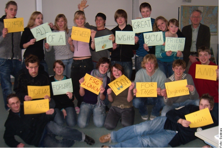 | | Es sind zwar nur 18 der 20 Austauschteilnehmerinnen und -teilnehmer auf dem Bild zu sehen, berichtet Herr Suckrau (im Foto hinten rechts), stellvertretender Schulleiter und Mit-Organisator des diesjährigen Schüleraustauschs mit der Webster Groves High School in Webster Groves High School, St. Louis, Missouri (USA), aber dafür strahlen sie umso mehr Begeisterung aus. Am 23. Februar kamen sie zum ersten Vorbereitungstreffen zusammen. Es wird ab jetzt alle 14 Tage stattfinden – in English, of course. Dabei wird es vor allem um die Erweiterung des interkulturellen Wissens und die konkrete Vorbereitung der Aktivitäten und der Präsentationen der Deutschen vor Ort gehen. Die Amerikaner organisieren gegenwärtig ihren entsprechenden exchange club mit gleichfalls regelmäßigen Treffen. Für die FSG-Eltern wird am 20. März ein weiterer Informationsabend stattfinden. Über das ganze Jahr verteilt halten Eltern, Lehrern und Schülern ständigen Kontakt per E-Mail und durch Treffen in der Schule. |