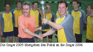 | Bericht zum »Generations Cup 2006« liegt jetzt vor |  | Alljährlich spielen Schüler eines einst von unserem Sport- und Erdkundelehrer Lothar Goder unterrichteten Grundkurses Sport gegen FSG-Lehrer um den »Generations Cup«. Das geschah am Freitag, dem 8. Dezember 2006, zum 15. Mal – man kann also durchaus von einer Tradition sprechen, erst recht in einer Zeit, die angesichts ubiquitärer Flexibilisierungsanforderungen an den Einzelnen wieder mehr Beständigkeit, Selbstvergewisserung und Orientierung in der Ausübung von Ritualen und der Überlieferung von Bewährtem sucht. Zum Spiel gehört immer auch der sportjournalistisch ambitionierte Spielbericht, den dieses Mal der (Ex-) Schüler Dr. Klaus Schönekaes verfasste. | |
