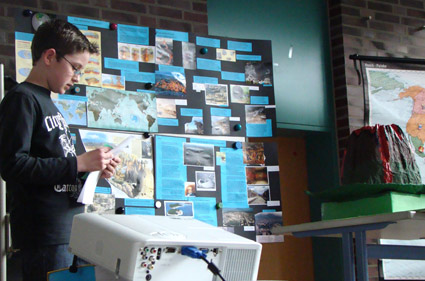 Viele Eltern, aber auch einige Mitschüler waren zur Präsentation der Projekte, die im Rahmen des »Drehtür«-Projektes entstanden waren, gekommen. Zehn Minuten hatte jede Gruppe, um ihr Ergebnis den gespannten Zuhörern zu präsentieren. Im Vorfeld und während der Pause hatten die Besucher Gelegenheit, die Stände der Schülerinnen und Schüler zu besuchen und sich ihre Forschungsgegenstände näher erklären zu lassen. Für die musikalische Untermalung in der Pause sorgte die Schülerband »Sound Craft«.