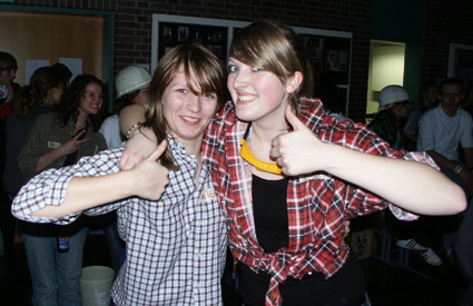 Danach waren die meisten so kaputt, dass die Schlange vor den Pommes und Würstchen, die einige der Schüler der SV und eine Lehrerin selbst brieten, immer länger wurde. Als Highlight des Abends veranstaltete Christian Reiners, der Schülersprecher, ein Lifekonzert mit seiner Band (drei E-Gitarren und eine Trommel). Die Schüler hörten begeistern zu und klatschten viel Beifall. Großes Lob an die Schülervertretung, sie hat es echt gut organisiert!!!