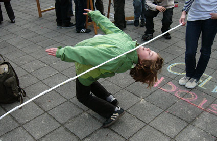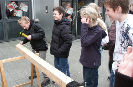 Heute fanden viele Aktionen statt, die eigentlich schon gestern stattfinden sollten, wegen des starken Regens aber nicht durchgeführt wurden. Katharina und Edda freuten sich an der Sonne und nagelten drauflos. Dabei gewann Edda. Auch beim Dünnbrettbohren bohrte man um die Wette. Beim Zollstocklimbo tanzte jeder gegen jeden und im Nu gab es eine lange Schlange. Oder lag es nur am Lied? Auf dem ganzen Schulhof musste man aufpassen, dass einem nicht irgendein Pömpel auf den Kopf flog. Aber seid beruhigt. Die Pömpel waren unbenutzt. Da fragt man sich doch gleich, woher die kamen. Wir sagen nur: »Alles Gute kommt von oben.« Zum Teil hatte die Oberstufe daran am meisten Spaß, die Pömpel über den halben Schulhof zu werfen. Bei dem Spiel, bei dem man Bälle in den Betonmischer werfen musste (wir nennen es jetzt mal Bällemixen), flogen über den ganzen Schulhof Bälle. Auch beim Kastenlauf mit Flaschen ging es lustig zu. Dort gewann Melissa gegen Svenja.