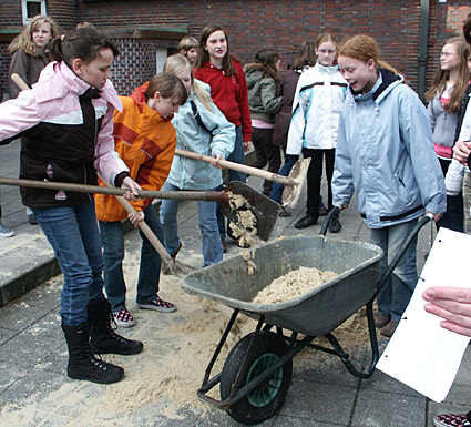 »Die Angebote in der Cafeteria sind lecker, aber zu teuer«, meinte die zwölf Jahre alte Katharina. In der zweiten Pause war das Wetter schon besser und es waren viel mehr Schüler auf dem Schulhof. in dieser Pause fanden trotz des schlechten Wetters die Aktionen »Schuhkartonmauerbau« und Schubkarrenrennen statt. Beide Aktionen waren ein voller Erfolg. Wir finden, dass die Aktionen zwar Spaß gemacht haben, aber dass das Wetter nicht mitspielte.