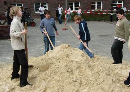 In der ersten Pause war kaum etwas los. Wegen des Regens, der an diesem Tag herrschte, wurden die Spiele der Aktionswoche »Hammer« leider abgesagt. Doch ein Spiel gab es: Sandschaufeln. Zwar haben nicht viele (oder eher gesagt: fast keine!) an diesem Spiel teilgenommen, doch den wenigen scheint es trotz des Regens ziemlichen Spaß gemacht zu haben.