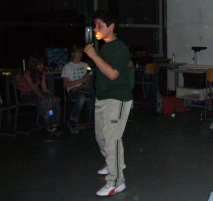 Die Kinder der Klasse 6b trafen gegen 19 Uhr in der Schule ein, wo sie bereits von den Lehramtsanwärter/innen Rusche, Schröder und Turek freudig in Empfang genommen wurden. Die Dekoration der zwei vorbereiteten Klassenräume zwei große Poster mit der Abbildung jeweils eines Geisterhauses, ein schwarzes Riesenspinnennetz an der Wand sowie ein bewegliches, im Dunkeln leuchtendes (Plastik-) Skelett stimmte die Sechstklässlerinnen bereits auf die Thematik des Abends ein: eine englische Gruselnacht. Diese Atmosphäre wurde zusätzlich untermalt durch Nacht- bzw. Gruselgeräusche, wie z.B. das Bellen eines Hundes, Miauen einer Katze, Knarren einer Tür, das furchteinflößende Gelächter eines GEISTES etc.