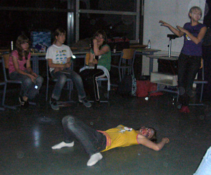 Nach der Begrüßung wurde ganz gemütlich im Stuhlkreis zu Abend gegessen, wobei die Kinder Proviant für sich und andere mitgebracht hatten. Sie stärkten sich also mit Würstchen, Brötchen und Broten, Salaten und Getränken…