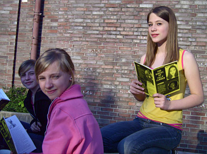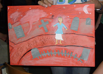 Bei der kreativen Erarbeitung war den Kindern die Wahl der Methode und des Mediums (Materialien) freigestellt. So entstanden sehr interessante und unterschiedliche „Produkte“: Zwei Mädchengruppen bastelten bzw. malten jeweils ein Poster mit der Darstellung der „Friedhofsszene“ und anhand der „Tafel-Graffitis“, die zwei Jungengruppen mit farbiger Kreide erstellt hatten, konnte das Geheimnis der Geschichte weiter aufgedeckt werden. Eine weitere Mädchengruppe ergänzte fehlende Informationen im Text, indem sie den Mord an Tilly Turner (ein Geschehen aus der Vergangenheit) in Form einer Tanzchoreografie darstellten. Diese Performance wurde durch einen „ghost rap“ (Sprechgesang), der von vier Jungen eigenständig verfasst wurde, begleitet.