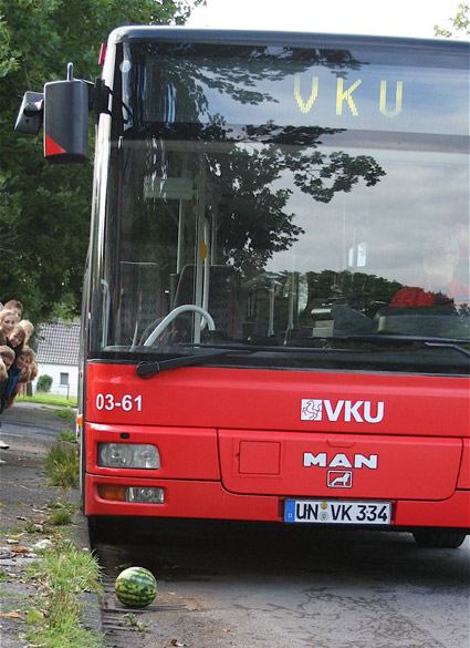 Ich fand es sehr schön, da mir vieles gefallen hat. Die Polizisten haben uns viel demonstriert, wie es zu einem Busunglück kommen kann. Als erstes gingen wir in die riesig große Aula des Freiherr-vom-Stein-Gymnasiums. Nach ca. einer dreiviertel Stunde gingen wir zum Bus. Da die 5a auch in den Bus musste, habe wir uns sehr darum bemüht, dass sich keiner in dem Getümmel weh tut. Nach einer Weile fuhren wir dann zum Cappenberger See. Als wir ankamen, zeigten uns die Polizisten, was passiert, wenn z.B. die Jacke stecken bleibt, das Handgelenk in der Bustür hängen bleibt oder der Fuß zwischen den Rädern steckt. Alles sowas kann sehr schmerzvoll sein oder werden. Dann zeigten sie uns noch, was passiert, wenn ein Bus über eine Wassermelone rollt, Das war echt cool, mal zu sehen, wie so etwas aussieht. Zum Schluss hat der Bus eine Vollbremsung bei 25 km/h gemacht und man glaubt ja, dass es nicht so schnell wäre, aber da täuscht man sich gewaltig, denn es war ziemlich schnell. Aber dann haben wir einen gewaltigen Stoß bekommen und waren super glücklich, weil es viel Spaß gemacht hat.