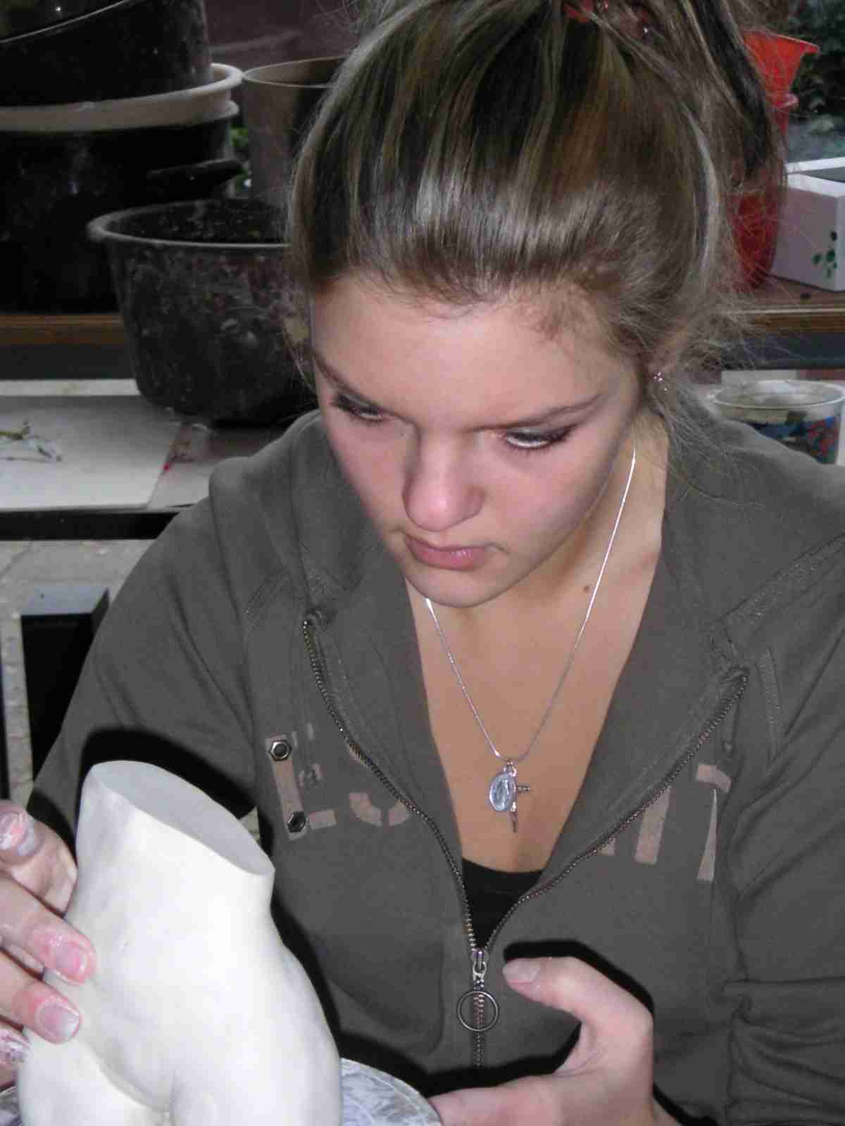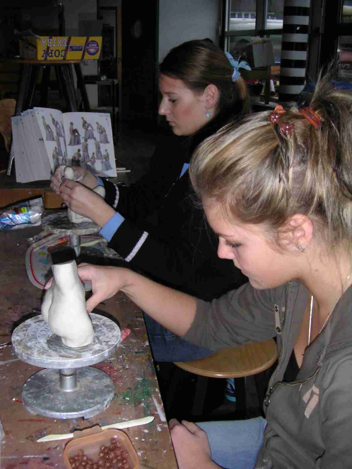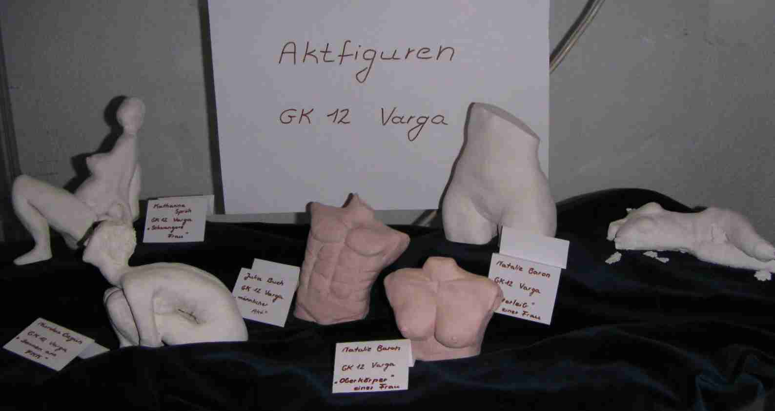 Unsere Aufgabe war ein Thema auszusuchen, mit dem wir uns beschäftigen wollten. Wir haben uns für das Thema »Akt« entschieden. Dazu sollten wir uns überlegen, was das Ergebnis unserer Arbeit werden sollte. Wir durften frei entscheiden über die Bearbeitung und die Präsentation unseres Projekts. Unsere Gruppe hat sich bei der Darstellung für das Zeichnen und das Formen von Aktfiguren entschieden. Bei unseren Figuren konnten wir uns zunächst nicht entscheiden aus welchem Material wir die Figuren formen wollten. Zur Auswahl standen Ton, Gips und Modelliermasse. Modelliermasse empfanden wir sehr geeignet. Nun mussten wir uns überlegen, welche Idee hinter unseren Figuren stehen soll. Daraus sind Figuren entstanden, die idealistisch, surrealistisch und fantastisch dargestellt sind. Die Figur »Oberkörper einer Frau« , »Unterleib einer Frau« und »Oberkörper eines Mannes« stellen die (nackten) Körperteile eines Menschen im idealistischen Stil dar. Die Darstellung der Arme beziehungsweise Beine waren den Künstlerinnen nicht wichtig und wurde somit ausgelassen. Die Figur »Embryo im Mutterleib« stellt die Situation einer schwangeren Frau und ihres ungeborenen Babys dar. Die Idee kam der Künstlerin, indem sie einfach versuchte, eine sitzende Frau zu verändern. Diese Figur ist absichtlich unvollständig gelassen worden. Zum Beispiel ist nur ein Teil ihres Körpers, wie ein Arm oder ein Beine dargestellt. Die abstrakte Veränderung wird deutlich, wenn man sich den Mutterleib ansieht. Die Figur »Sonnen am FKK-Strand« stellt eine nackt sonnende Frau dar. Die Frau sitzt mit über den Knien verschränkten Armen, das Gesicht nach oben zur Sonne gewandt. Diese Figur ist ein Zwischending surrealistischer und idealistischer Darstellung. Die letzte Figur ist eine fantastische wie auch idealistische Darstellung. Es ist ein nackter Körper einer Frau mit scheinbar ausfransenden Gliedmaßen, ihr Hals ähnelt einem Baumstumpf. Sowohl die Arme und Beine, wie auch der Hals sind mit Blättern besetzt. Diese Figur soll die beschädigte jedoch unschuldige Natur darstellen. Der Mensch spielt dabei eine Entscheidende Rolle, da er der Hauptschädling der Natur ist. Am Ende wurde noch von jeder Gruppenteilnehmerin ein Bild gemalt, bei dem die Pose des Aktes festgelegt wurde. Die fertigen Bilder mit den unterschiedlichen Umgebungen war dann am Ende eine »Überraschung«. |