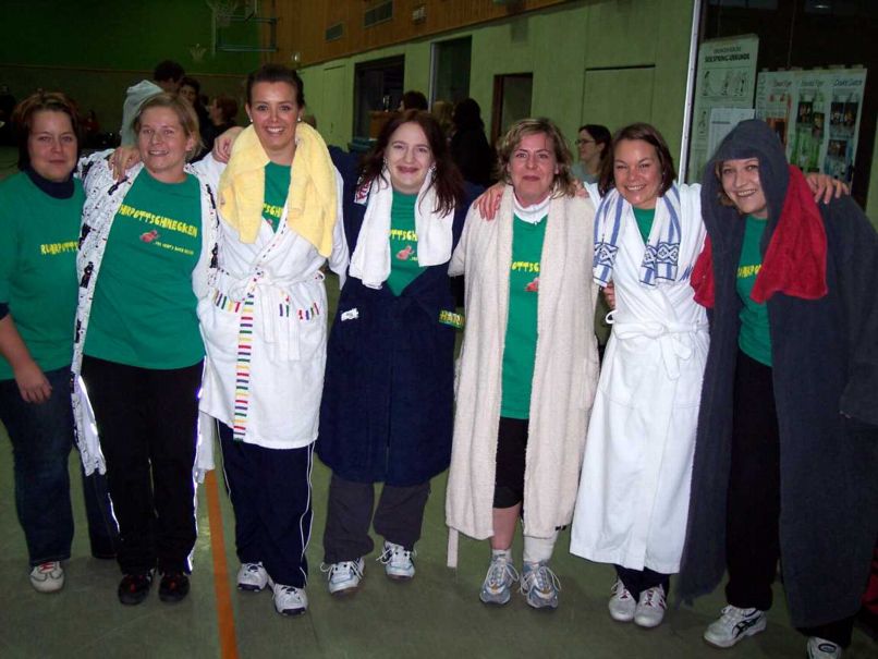 | Die »SchOllis« hießen im vorletzten Jahr »Scholli und Olli«. Im letzen Jahr nannten sie sich »Scholli ohne Olli« und belegten den achten Platz. Dazu schrieb Michael Wiegers in seinem wie immer ausführlichen Anmeldeschreiben: »Das ist nun schon die 5. Namensänderung. Wie immer liegt es an Olli. Er hat sich noch nicht endgültig geäußert, ob er sich nach unserem erfolgreichsten Jahr der Turniergeschichte in diesem Jahr nochmals motivieren kann. Vermutlich liegt es daran, dass er im letzten Jahr nicht teilnehmen konnte und immer noch enttäuscht ist, den grandiosen Erfolg nicht mitgefeiert zu haben.« Olli kam wieder nicht. Das kinderreichste Team des Turniers (alle Kinder konnten nicht gleichzeitig für die Dauer einer Aufnahme festgehalten werden) belegte Rang elf. |