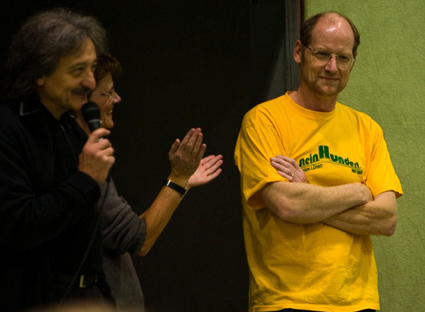 Die Siegerehrung wurde nicht wie üblich in der Halle, sondern während der Party durchgeführt. Jürgen Czischke gratulierte Fred Steinberg vom Oldie-Dreamteam zu der einzigartigen Rollator-Aktion, die neue Maßstäbe für die Selbstdarstellung der teilnehmenden Mannschaften gesetzt hat.