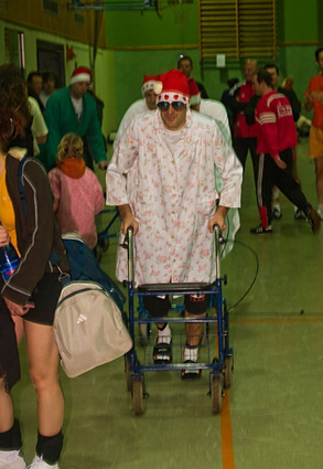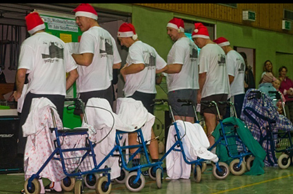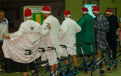 Den Brüller des Turniers lieferten in diesem Jahr die Oldies. Die Halle tobte, als eine Greisengruppe auf Rollatoren gestützt hereinschlich und anschließend auf geradezu laszive Art und Weise einen Bademantelstrip hinlegte.