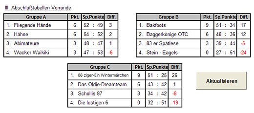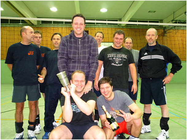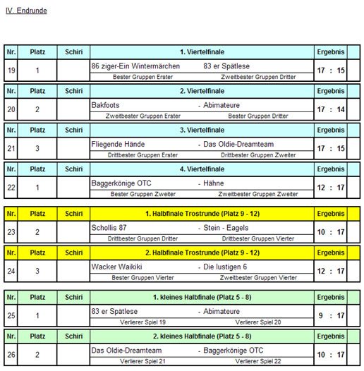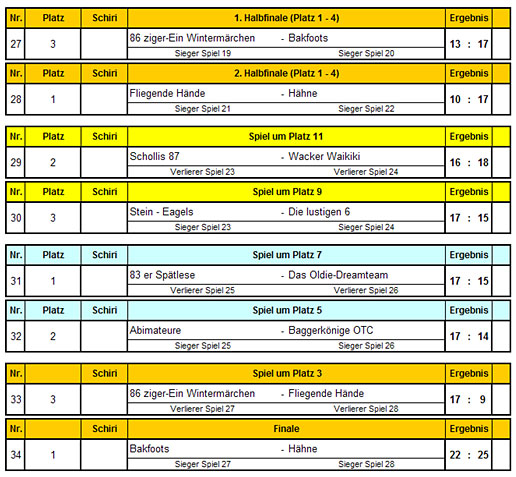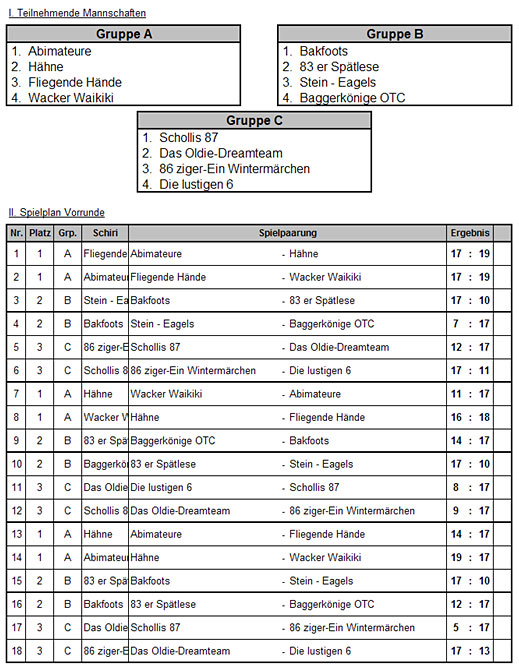 Für alle völlig überraschend gewinnen die Hähne das Turnier mit einer sensationellen Leistung. Die Hähne waren zunächst nur zu viert aufgelaufen (Mike Szepoks, Martin Wolf, Ulf Kulinna und Heiko Rupprecht), fanden aber bei den 83ern hilfsbereite und erfahrene Unterstützer. In einem spannenden Finale besiegten sie die sehr starken Bakfoots mit 25 : 22! Herzlichen Glückwunsch!